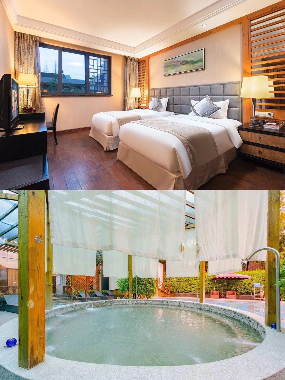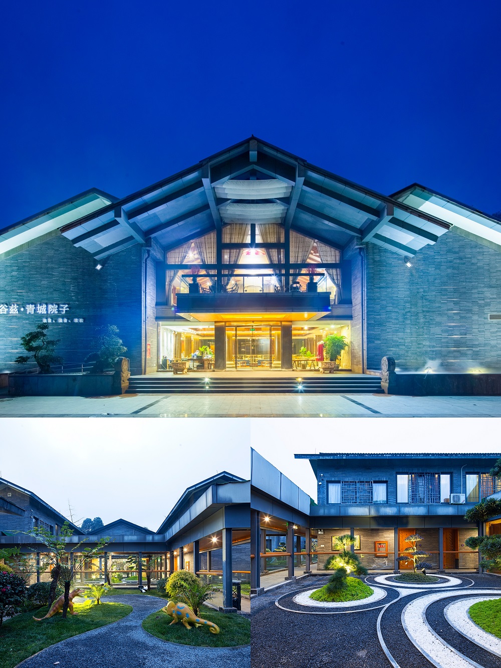 谷兹.青城院子温泉美食度假酒店属谷兹酒店集团旗下高端品牌酒店,占7000余平米,地处国家5A级景区青城山前山,这里有高于20倍世卫组织的空气标准,被喻为天然氧吧。酒店交通便利:距离成灌高铁终点站仅500米,步行15分钟;距离街子古镇、普照寺仅4公里,车行10分钟即可;酒店门口有102公交站台,直达都江堰景区及客运中心,交通十分便利。酒店是集住宿、温泉餐饮、娱乐养身、亲子一体的度假胜地。